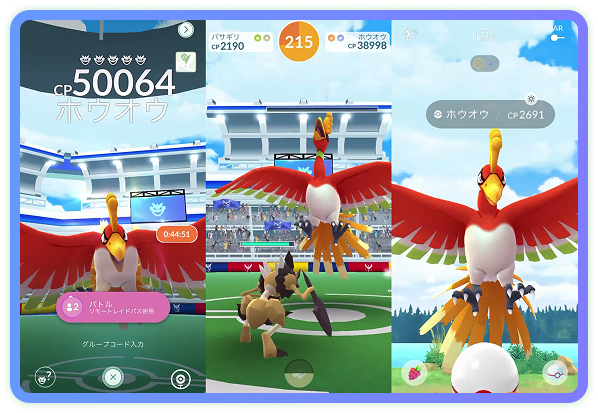 CP 制限なし。フル強化したポケモンや伝説のポケモンが活躍する、最高峰の舞台です。 | レイドバトル | 他のトレーナーと協力して、強力な「レイドボス」の撃破を目指します。 |